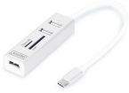 This USB hub by Delock can be connected to a computer, laptop or mobile device via the USB-C™ interface. It expands the computer by 2 USB Type-A ports. Different USB devices such as USB flash memory, card reader, external enclosure etc. can be connected Integrated Card Reader In addition, the hub with integrated card reader expands a PC or laptop by an SD and a Micro SD slot Small, stable and handy Due to its small dimensions and its sturdy housing, this Delock hub is particularly suitable for travelling. It can simply be packed into the bag together with the laptop or tablet and used as needed. Due to the special design with eyelet, the hub can be easily attached to the key ring for transport